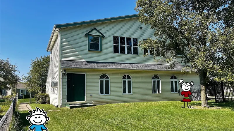 a group of people in front of a house
